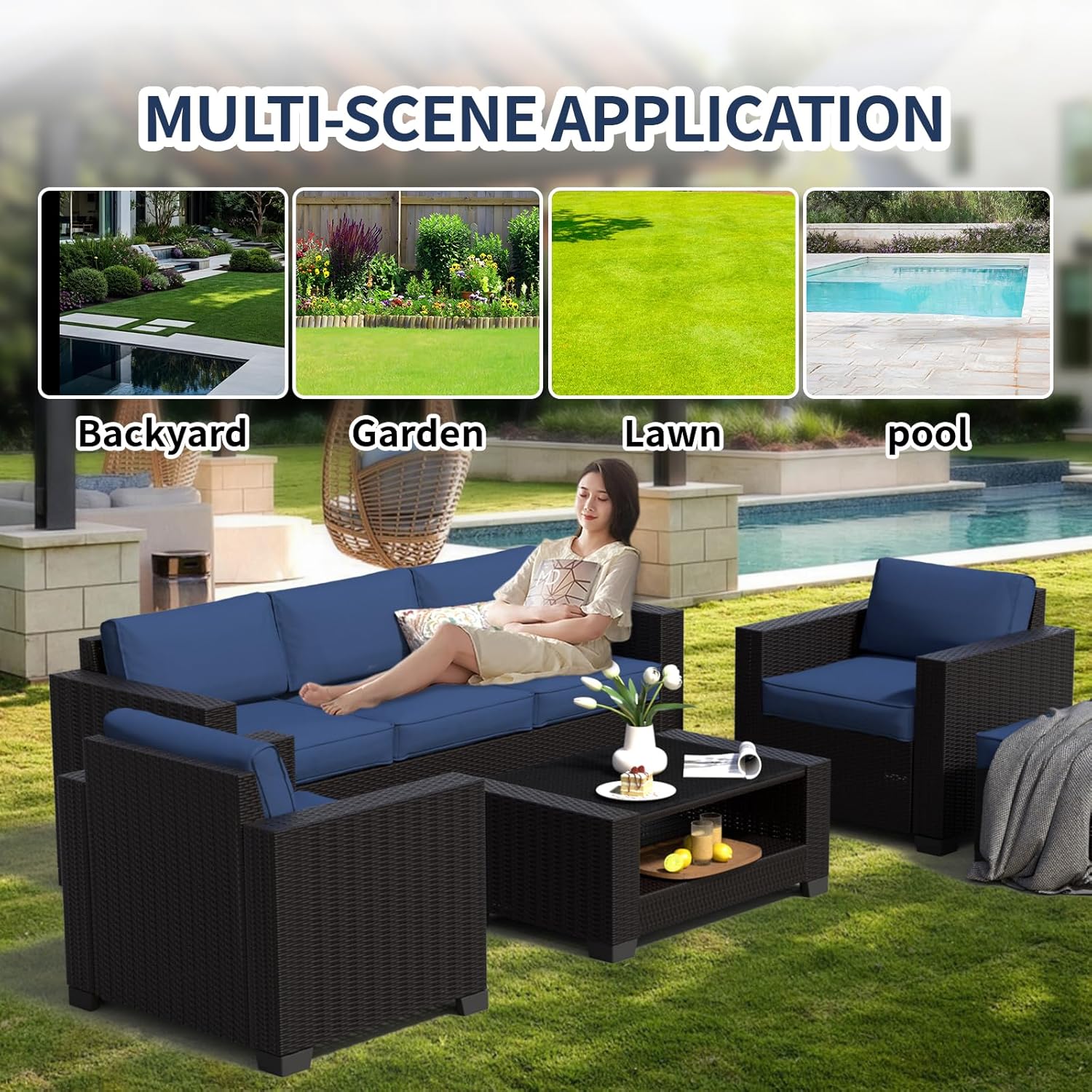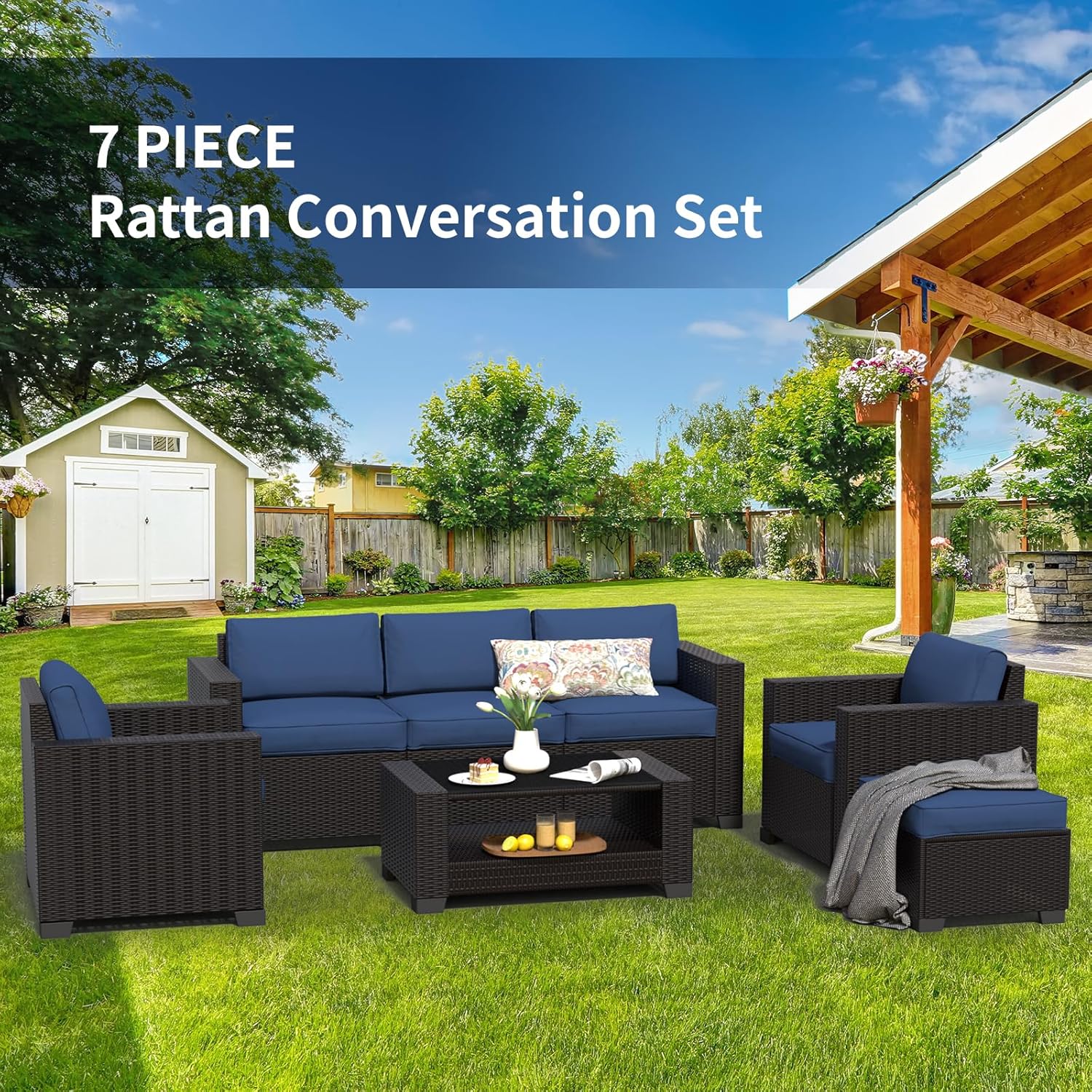 【 High quality material, strong structure 】Durable in any weather: Made of high-quality PE cane and a robust powder-coated steel frame, this set is designed to withstand UV light, water resistance, heat and cold, ensuring durability. Toughened safety glass on the coffee table adds an extra layer of security for families with children or pets.